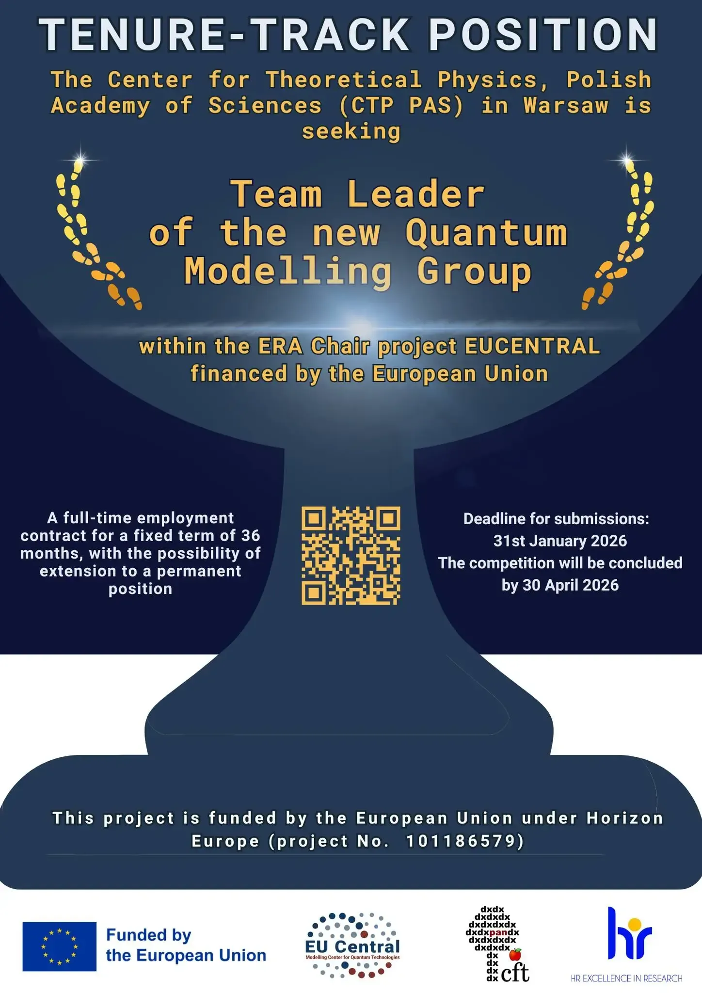 The Centrum Fizyki Teoretycznej Polskiej Akademii Nauk (Warsaw, Poland) is opening a tenure-track position for a Team Leader within the EU-funded EUCENTRAL – ERA Chair project.